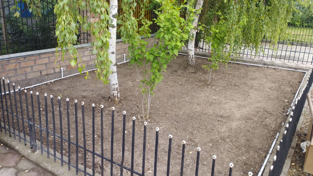 Приступаем к реализации: выполняем подготовку почвы, укладываем чернозем, производим монтаж системы автополива, высаживаем растения и укладываем газон.